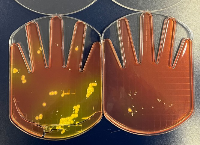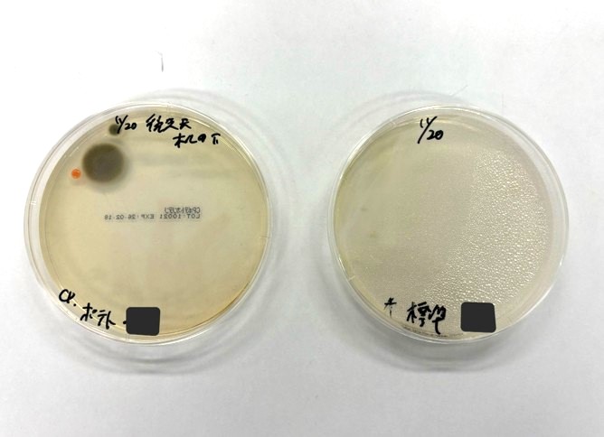 ②ふき取り検査結果(左:酵素基質寒天 右:標準寒天)