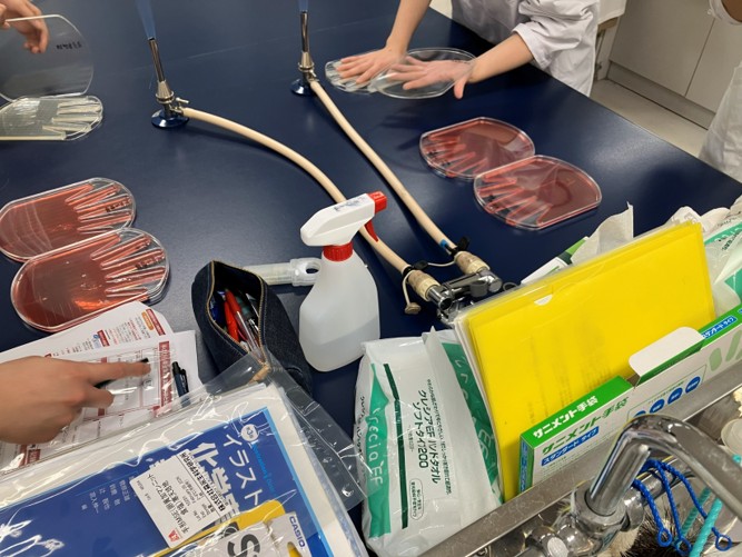 - 今回の実習では、椅子の拭き取り検査、落下菌検査、手指の衛生評価を行い、環境や人体に存在する微生物の違いについて理解を深めることができました。微生物検査は数値を得るだけでなく、背景要因を考察することが重要であると理解できました。